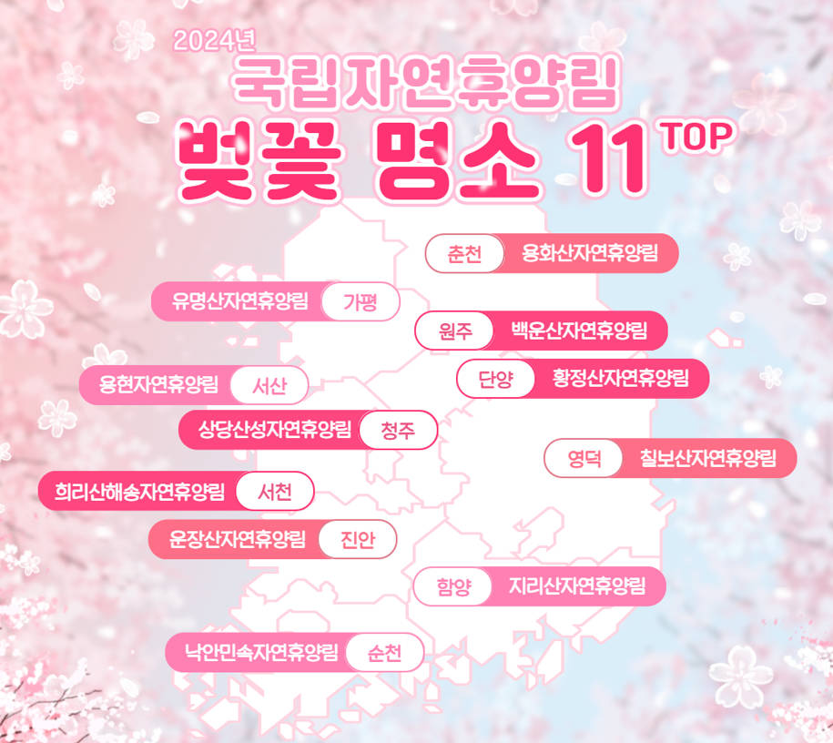 봄이면 우리의 마음을 설레게 하는 것 중 하나가 바로 벚꽃입니다. 짧은 기간 동안만 만날 수 있는 벚꽃의 아름다움은 봄의 대표적인 상징이며, 연분홍 꽃잎이 활짝 터지는 순간을 기다리며 봄을 맞이하는 것은 많은 이들에게 큰 기쁨입니다. 벚꽃은 그 화려함과 아름다움으로 인해 봄을 대표하는 꽃이라 할 수 있으며, 그 감상 기간이 짧아 더욱 소중하게 느껴집니다. 이러한 벚꽃의 아름다움을 가까이에서 느끼고자 하는 많은 분들이 사랑하는 가족, 연인, 친구와 함께 벚꽃 여행을 계획하고 계실 것입니다. 이에 국립자연휴양림관리소에서는 전국의 벚꽃 명소 TOP11을 소개해 드리고자 합니다. 전국에 위치한 45개의 국립자연휴양림은 대부분 도심을 벗어난 곳에 위치해 있어, 상춘객으로 붐비는 관광지와는 달리 조용하고 고즈넉한 분위기에서 벚꽃을 감상할 수 있는 것이 큰 장점입니다. 봄철에 국립자연휴양림의 야영장이나 객실을 이용하여 휴식을 취하고자 하는 분들은 전국 자연휴양림 통합예약시스템 '숲나들e'를 통해 예약하실 수 있습니다. 벚꽃을 감상하며 평온한 숲 속에서 휴식을 취하고, 일상으로 돌아갈 때 새로운 활력을 얻으시길 바랍니다. 다만, 봄철은 산불이 발생하기 쉬운 시기이므로 산불 예방에 각별히 주의해 주시기 바랍니다.