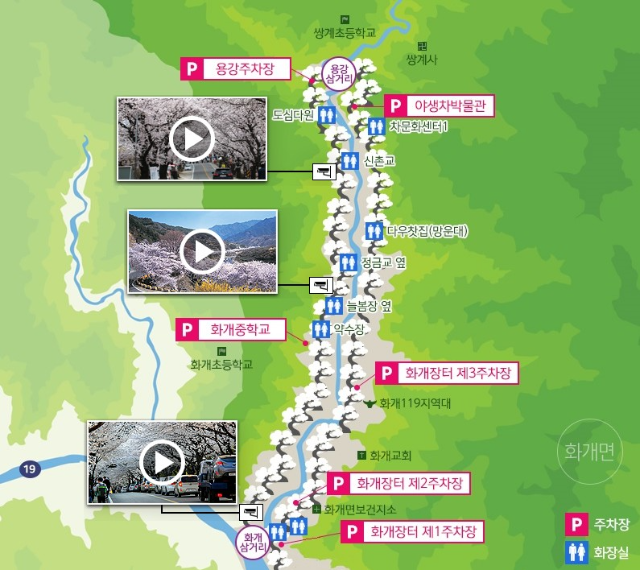 매년 3월이 시작되면 "벚꽃이 언제 피나요?"라는 문의가 늘어나는데, 하동군청 홈페이지에서는 실시간 개화 정보 영상을 통해 답해줍니다. 실시간으로 벚꽃 개화 상황을 확인하고 여행 일정을 조절하고 싶다면, '알프스 하동 실시간 벚꽃개화정보' 사이트를 살펴보세요. 해당 사이트는 화개삼거리부터 쌍계사까지 이어지는 도로 라인에 설치된 3개의 CCTV를 통해 실시간 벚꽃 개화현황을 온라인으로 제공합니다. 동영상 재생 버튼을 누르면 웹캠을 통해 화려한 벚꽃의 피어나는 모습을 실시간으로 감상할 수 있습니다.