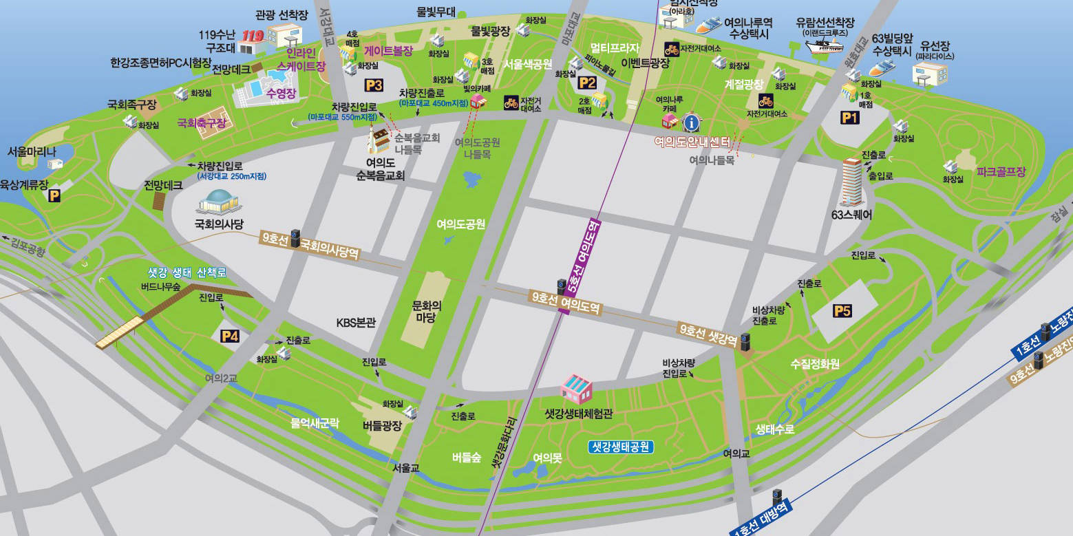 - 여의도 물빛무대(수상무대) : 4~10월 금·토 정기공연 및 대관공연, 5~10월 화 ·수 ·목 ·일 수상분수가동